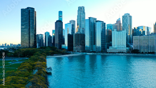 © Aerial Drone Footage, Naklejka premium Aerial view of Chicago lakefront and city skyline