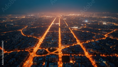 © Maryna, Naklejka premium Aerial view of city grid at night. Illuminated streets glow like circuit board in dark metropolis. Urban landscape shows energy data, traffic network. Cityscape extends to glowing horizon under