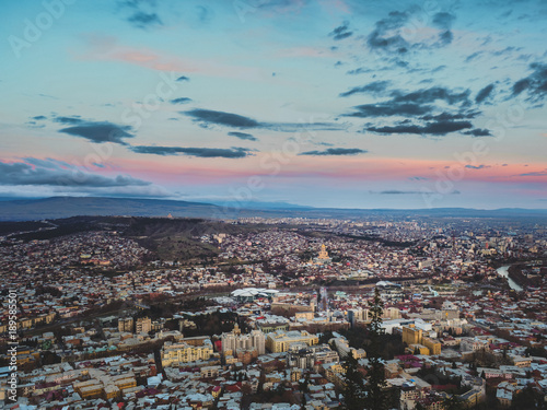 Fototapeta premium aerial view of city in Georgia and sky at sunset