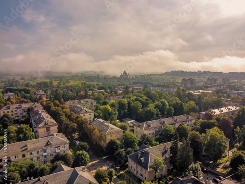 © Stanislav, Fototapeta premium Aerial vIew of city Novyy Rozdil by drone. Summer Ukraine Lviv region, West Ukraine. Fog.