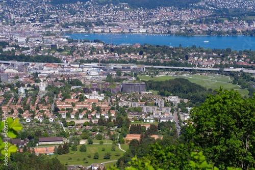 Fototapeta premium Aerial view of City of Zürich and Lake Zürich seen from local mountain Uetliberg on a sunny spring day. Photo taken May 18th, 2022, Zurich, Switzerland.