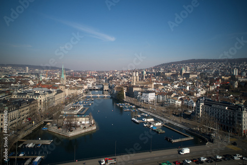 © Michael Derrer Fuchs, Obraz premium Aerial view of City of Zürich with river Limmat, the medieval old town and lake Zürich on a sunny spring afternoon. Photo taken March 4th, 2022, Zurich, Switzerland.