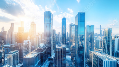 Obraz premium Aerial View of City Skyline and High-Rise Buildings Under Blue Sky and White...