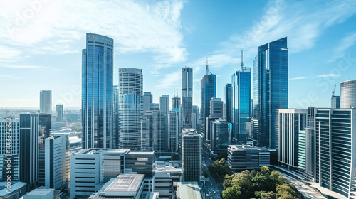 Fototapeta premium Aerial View of City Skyline and Skyscrapers Under Blue Sky and White Clouds