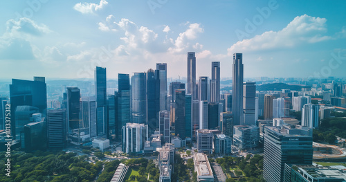 Naklejka premium Aerial View of City Skyline and Skyscrapers Under Blue Sky and White Clouds