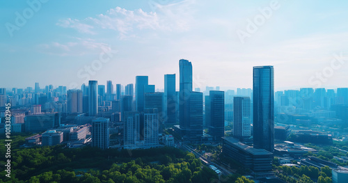 © song, Fototapeta premium Aerial View of City Skyline and Skyscrapers Under Blue Sky and White Clouds