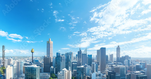 Fototapeta premium Aerial View of City Skyline and Skyscrapers Under Blue Sky and White Clouds