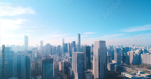 © song, Naklejka premium Aerial View of City Skyline and Skyscrapers Under Blue Sky and White Clouds