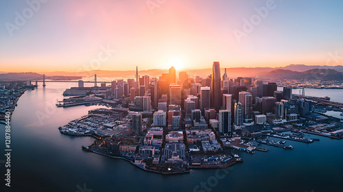 © Robin, Fototapeta premium Aerial View of City Skyline at Sunrise