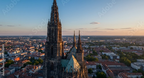 © arazka, Naklejka premium Aerial View of City with Tall Church Spire at Dusk