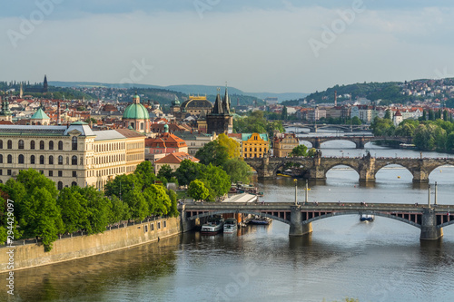 © zz3701, Obraz premium Aerial view of citycape of old town of Prague, with a lot of rooftops, churches, and the landmark of Charles Bridge, and Vltava river.