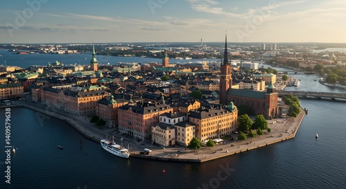 © arazka, Obraz premium Aerial View of Cityscape with Historic Buildings and Waterways