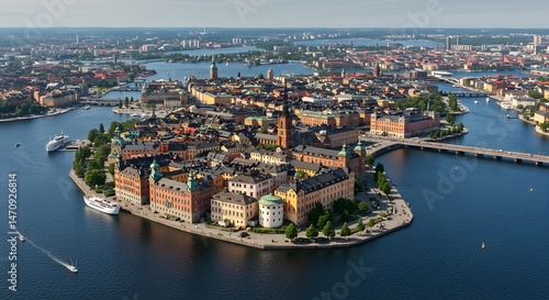 © arazka, Obraz premium Aerial View of Cityscape with Waterways and Historic Buildings