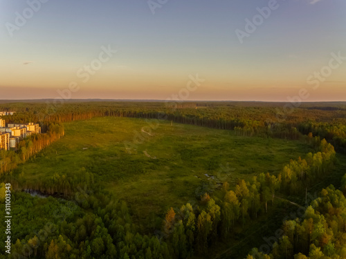 Naklejka premium Aerial view of cleared plot of wood for new budget housing on city outskirts