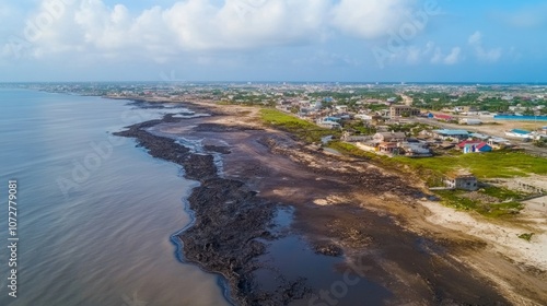 © Robin, Fototapeta premium Aerial view of coastal area with dark, sticky tar covering beach and seawater, highlighting environmental pollution and providing copy space for text or design.