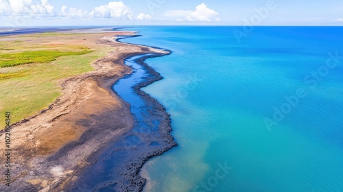 © merida, Obraz premium Aerial View of Coastal Beach Covered in Dark Tar, Emphasizing Environmental Pollution