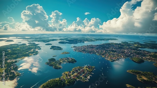 Naklejka premium Aerial view of coastal city with islands, boats, and blue water under a...