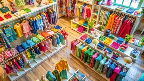 © Supittra, Fototapeta premium Aerial View of Colorful Children’s Clothing Hanging on Hangers in a Retail Shop, Showcasing a Vibrant Collection of Outfits for Kids in a Brightly Lit Environment