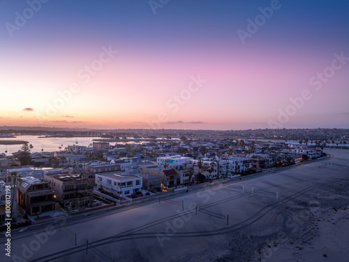 © tamas, Obraz premium Aerial view of colorful sunrise sky over Mission Beach San Diego with residential vacation homes, villas with nobody on the street