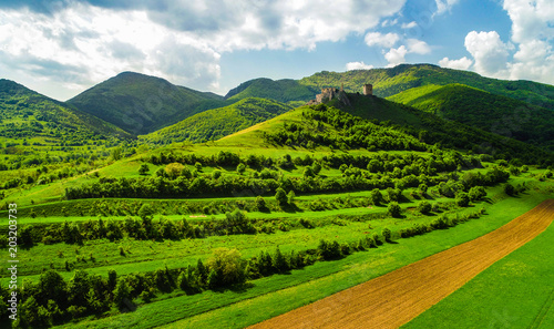 © CM - photographer, Fototapeta premium Aerial view of Coltesti Fortress in Transylvania, Romania on a sunny spring day with green hills around and beautiful blue sky with clouds