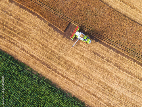 © ValentinValkov, Fototapeta premium Aerial view of combine on harvest field