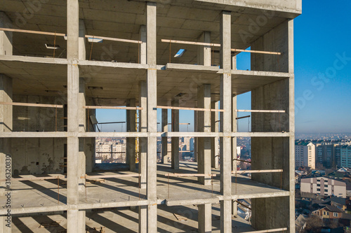 Obraz premium Aerial view of concrete frame of tall apartment building under construction...