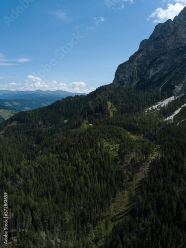 Fototapeta premium Aerial view of coniferous forest spruce trees on highland, Dolomites Alpine mountains. South Tyrol landscape Italy Europe. Summer. Travel
