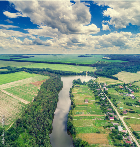 © vvvita, Fototapeta premium Aerial view of countryside and river with a beautiful sky. Forest and village along the river