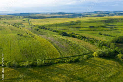 © salajean, Fototapeta premium Aerial view of countryside vibrant green hills. Transylvania, Romania