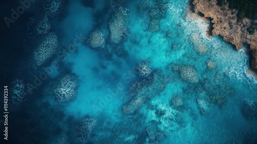 Fototapeta premium Aerial View of Crystal Clear Ocean Waters with Coral Reefs and Rocky...