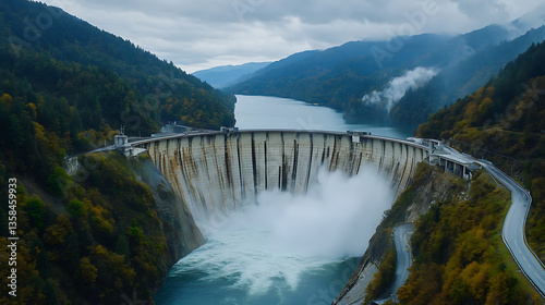 © Aka, Fototapeta premium Aerial View Of Dam Structure Breaking Amidst Forested Mountains Showing Rushing Water And Overcast Skies