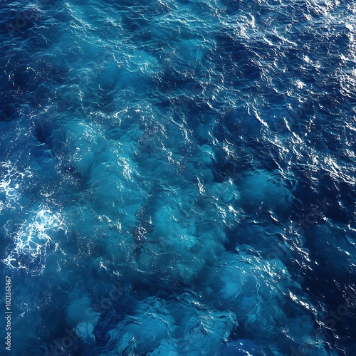 © Vikarest, Obraz premium Aerial view of deep blue ocean water with sunlight reflections creating a mesmerizing pattern.