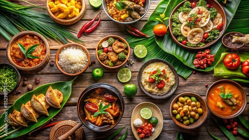 © Arnada, Fototapeta premium Aerial View of Delicious Thai Food Set - Colorful Dishes & Tropical Setting