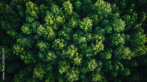© kasmaran, Naklejka premium Aerial view of dense, green forest canopy.