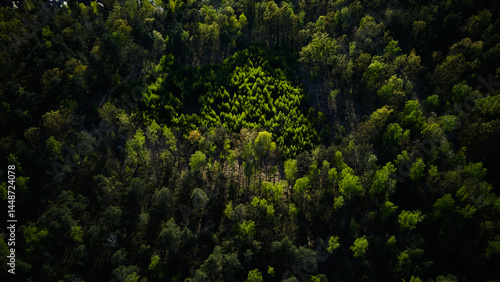 Obraz premium Aerial view of dense green forest canopy in sunlight and shadow
