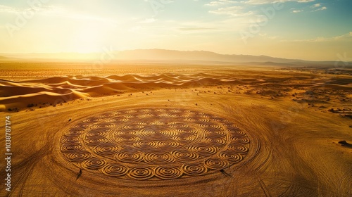 © Thru., Naklejka premium Aerial view of desert crop circles with intricate spiral designs in the sand. Warm golden and orange tones illuminated by the midday sun.