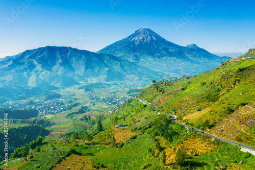 Fototapeta premium Aerial view of Dieng Plateau with Mount Sindoro