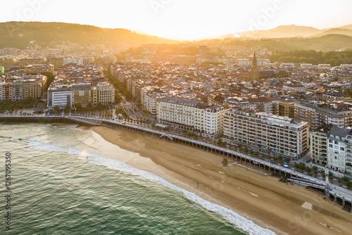 © Mazur Travel, Fototapeta premium Aerial view of Donostia - San Sebastian cityscape at sunrise, Spain