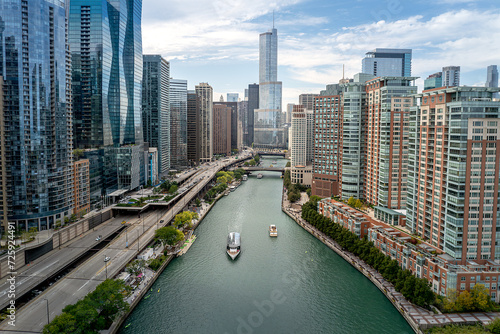 Obraz premium Aerial view of downtown Chicago, Illinois, USA. Boats moving up and down the...