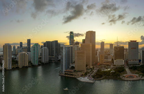 © bilanol, Fototapeta premium Aerial view of downtown district of of Miami Brickell in Florida, USA at sunset. High commercial and residential skyscraper buildings in modern american megapolis