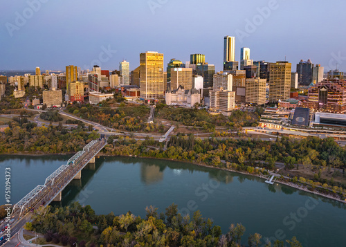 © Thomas, Fototapeta premium Aerial view of downtown Edmonton skyline at sunrise, Alberta, Canada