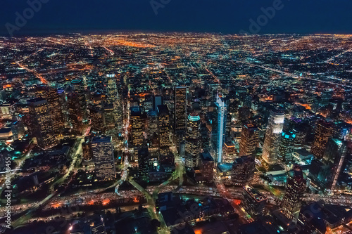 Fototapeta premium Aerial view of Downtown Los Angeles at twilight with young woman holding out...