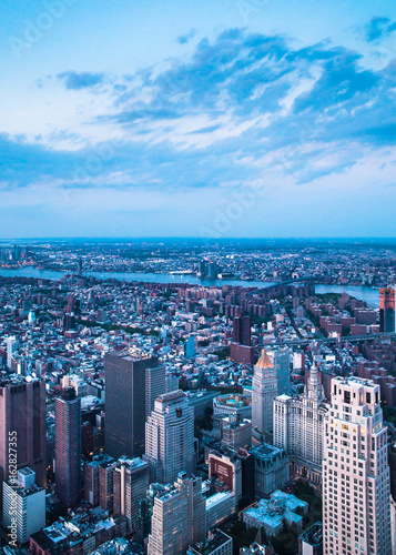 © littleny, Fototapeta premium Aerial view of downtown Manhattan and Financial District at dusk.