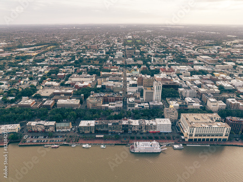 © Micah, Fototapeta premium Aerial View of Downtown Savannah and River Street