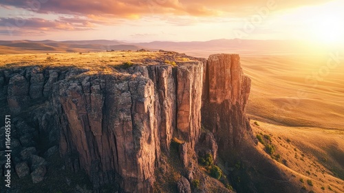 Fototapeta premium Aerial view of dramatic cliffs illuminated by sunset with vibrant sky over expansive landscape showcasing natural beauty and rugged terrain