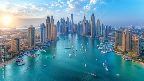 © Alisa, Fototapeta premium Aerial view of Dubai skyline with skyscrapers and yachts in the water. AI generative. .