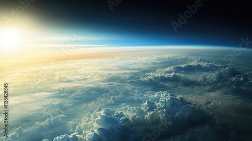 © Rizvan, Fototapeta premium Aerial view of Earth and clouds from an airplane window with a stunning sunrise in the background, capturing the beauty of our planet.