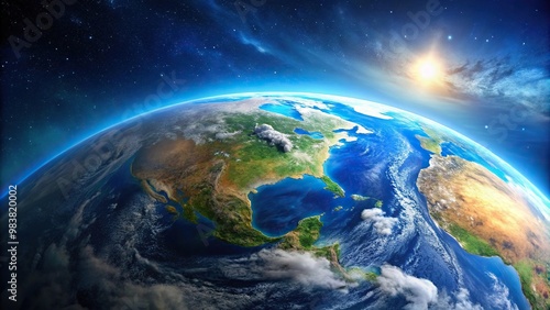 © Sayfar, Fototapeta premium Aerial view of Earth from orbit with blue background