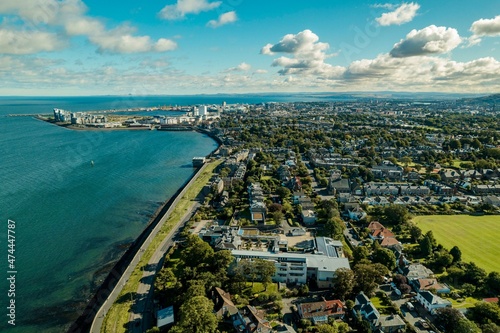 © Damian, Fototapeta premium Aerial View of Edinburgh, harbour. Iconic marina, the sun sets over the city of Edinburgh, the breath-taking architecture of this capital city making it a popular tourist destination