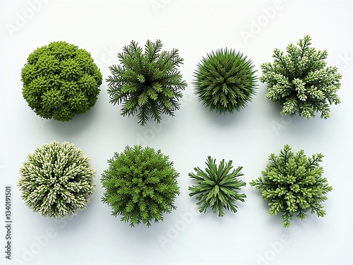 © Lensora, Fototapeta premium Aerial View of Eight Diverse Green Shrubs and Bushes on White Background